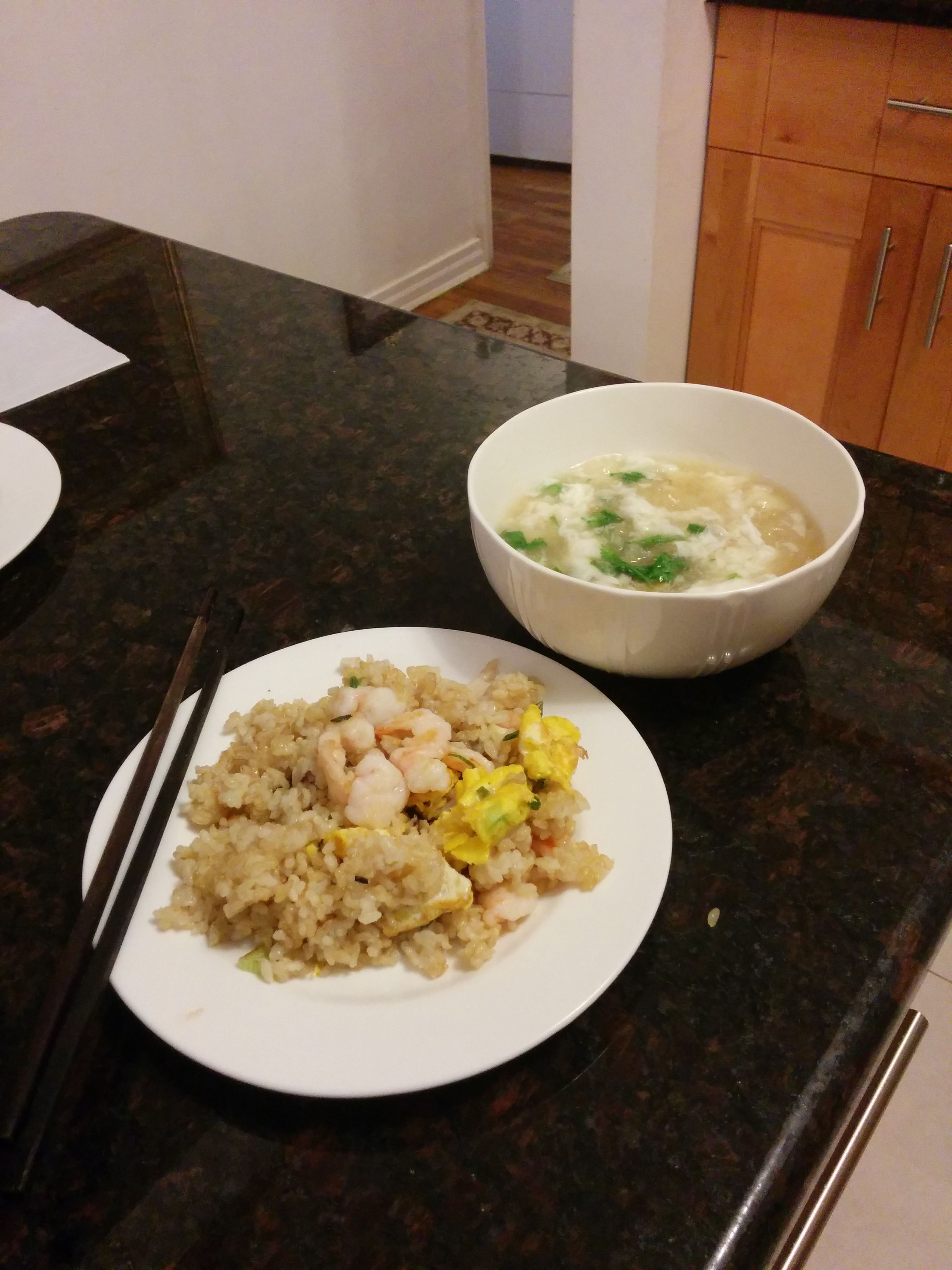 Here’s an attempt at shrimp fried rice along with some fish maw soup that includes cilantro!